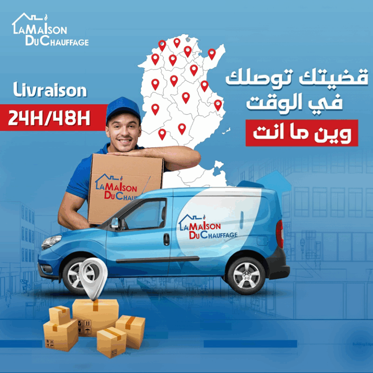 - Toutes les régions de Tunisie : Livraison gratuite pour toute commande supérieure ou égale à 5000 DT (à l’exception des chaudières et chauffe-bains)