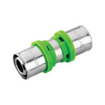 Raccord droit en laiton chromé, conçu pour tube PEX Ø16 mm avec système de connexion à sertir.