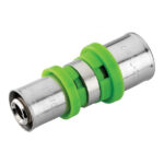 Raccord droit en laiton chromé, conçu pour raccorder un tube PEX Ø20 mm à un tube PEX Ø16 mm grâce au système à sertir
