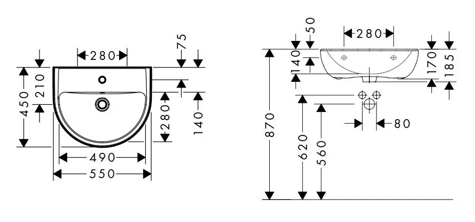 Dimensions extérieures du bassin: 550x450x170 mm (L x P x H)